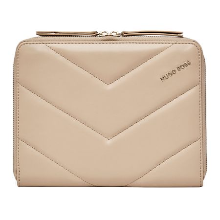 Hugo Boss Triga Folder A5 odlikuje se ženstvenim i elegantnim dizajnom, upotpunjenim luksuznim zlatnim detaljima i mat teksturom veganske kože. Prefinjena zlatna HUGO BOSS logo pločica daje upečatljiv, ali diskretan potpis brenda.