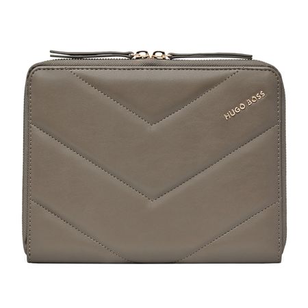 Hugo Boss Triga Folder A5 odlikuje se ženstvenim i elegantnim dizajnom, upotpunjenim luksuznim zlatnim detaljima i mat teksturom veganske kože. Prefinjena zlatna HUGO BOSS logo pločica daje upečatljiv, ali diskretan potpis brenda.